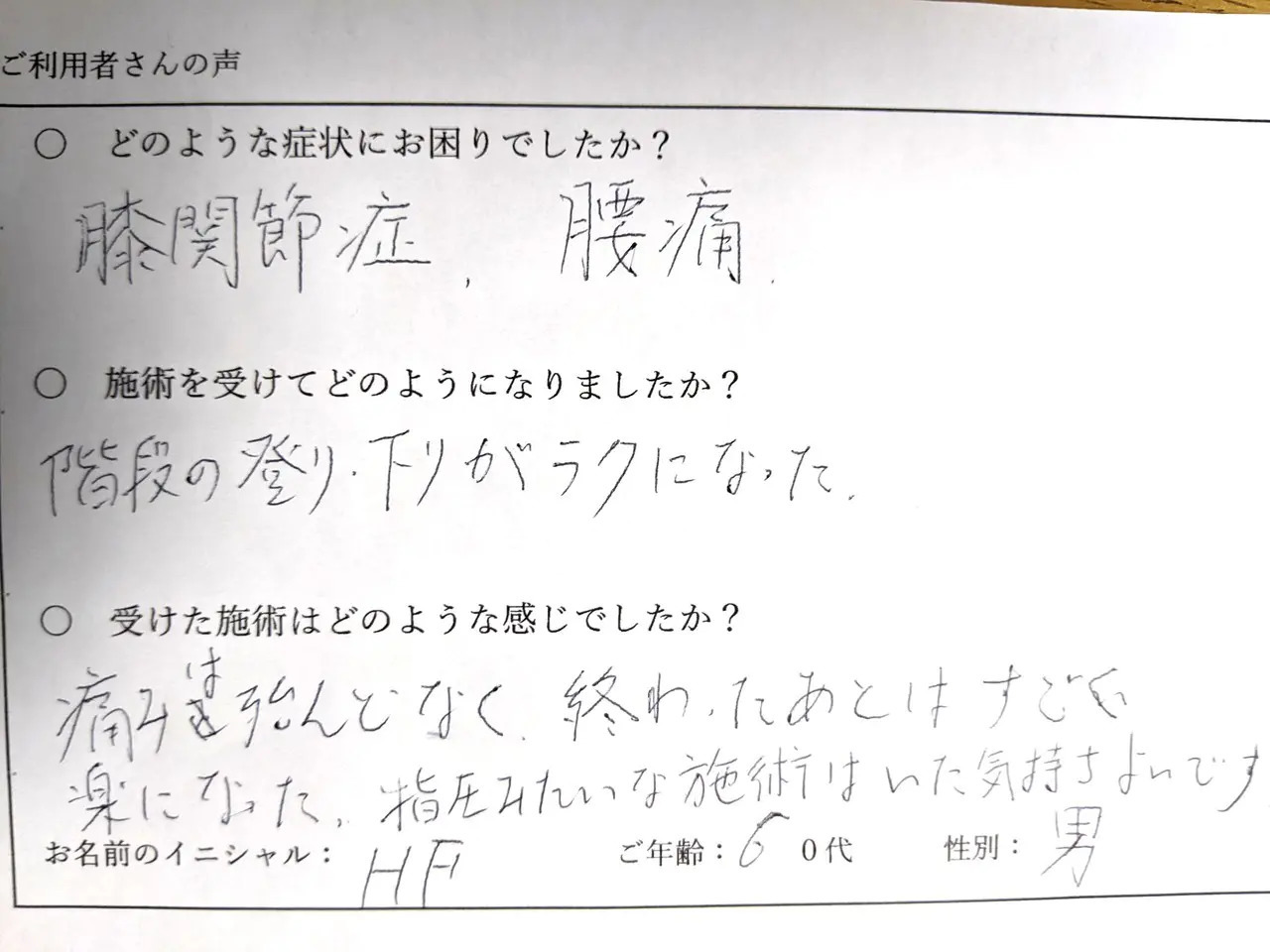 施術を受けて次の日に痛みがなくなり、体が軽くなりました。