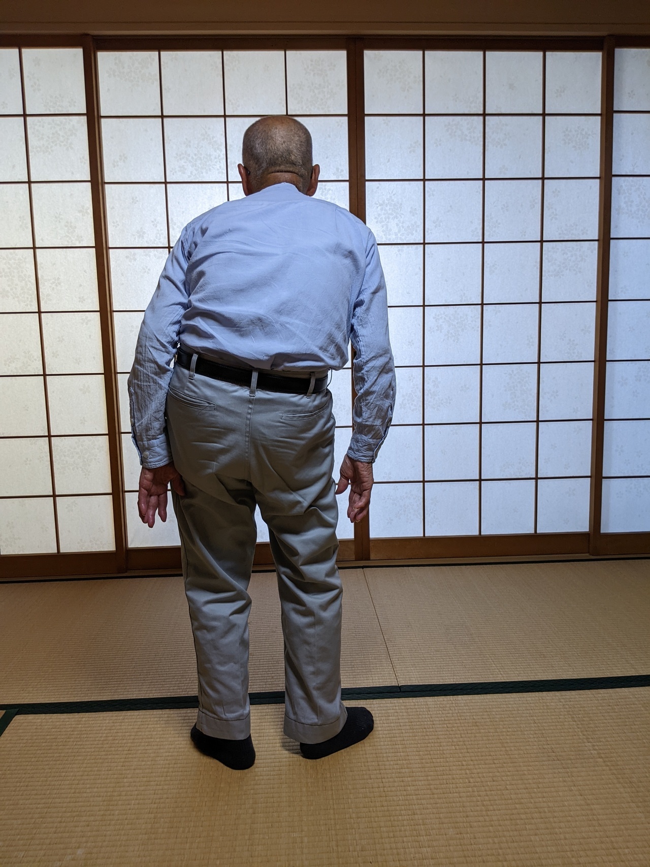 1回目施術後。上体が起きて頭の位置が変わり、胸も開き手の位置が変わりました。又、ベルトの角度がゆるくなりました。
