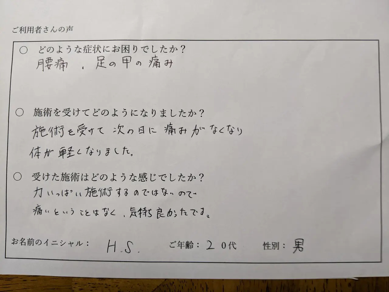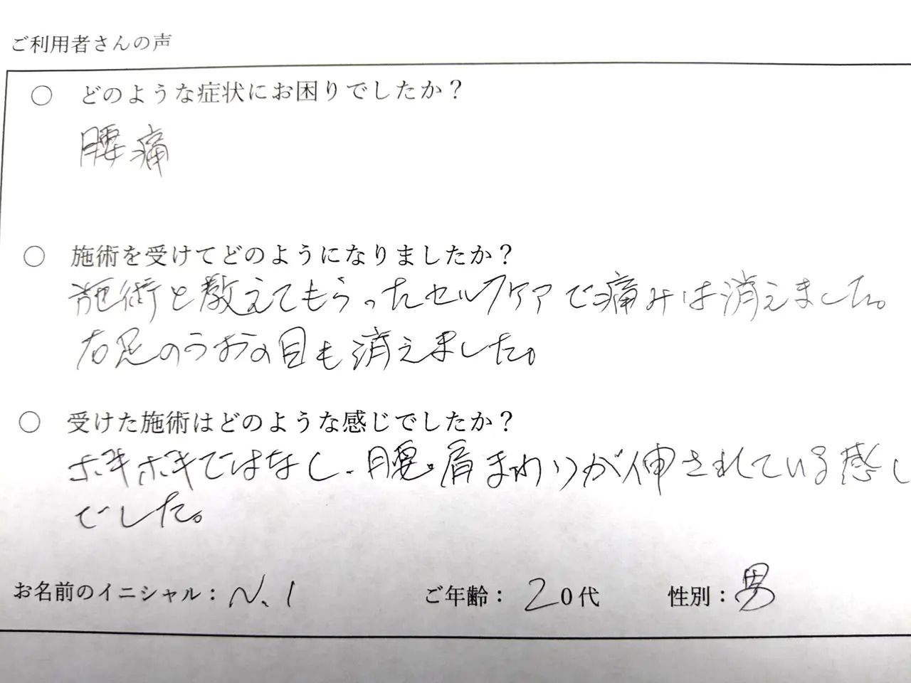 施術を受けて次の日に痛みがなくなり、体が軽くなりました。