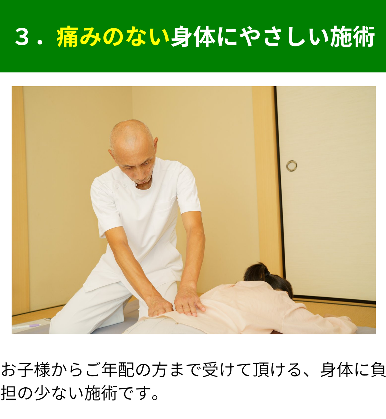 痛みは殆んどなく、終わったあとはすごく楽になった。指圧みたいな施術は、いた気持ち良いです。